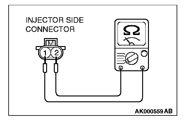 3. Measure the resistance between injector side connector terminals No. 1 and No. 2.