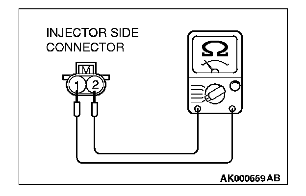 2. Measure the resistance between each injector side connector terminals No. 1 and No. 2.