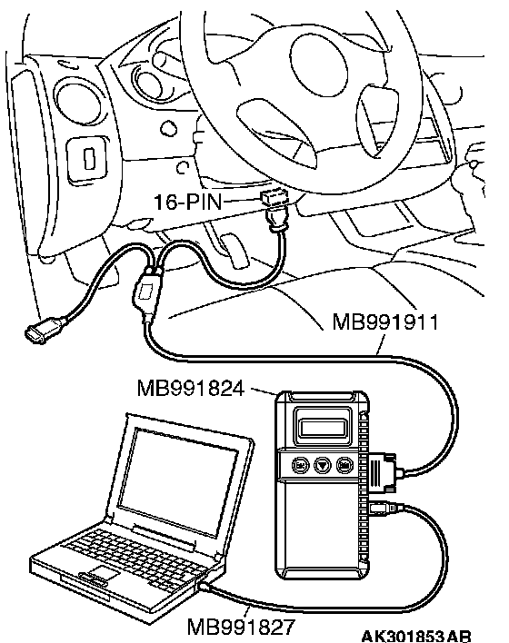 CAUTION: To prevent damage to scan tool MB9911958, always turn the ignition switch to the "LOCK" (OFF) position before connecting or disconnecting scan tool MB9911958.