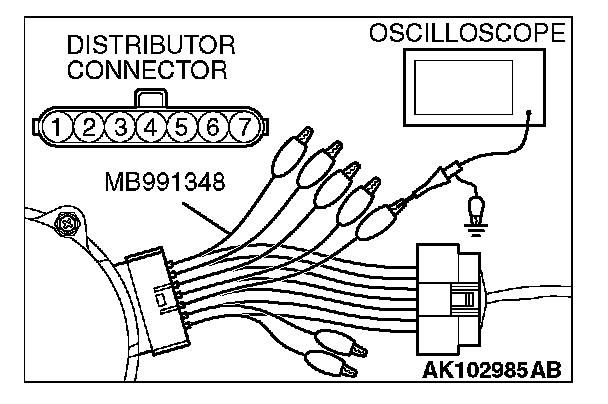 1. Disconnect the connector, and connect test harness special tool, (MB991348), in between. (All terminals should be connected.)