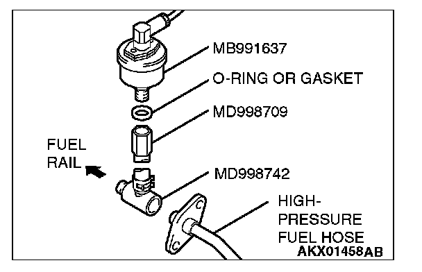 2. Install special tool MB991637 (fuel pressure gauge set) into assembled special tools MD998709 and MD998742 via a gasket.