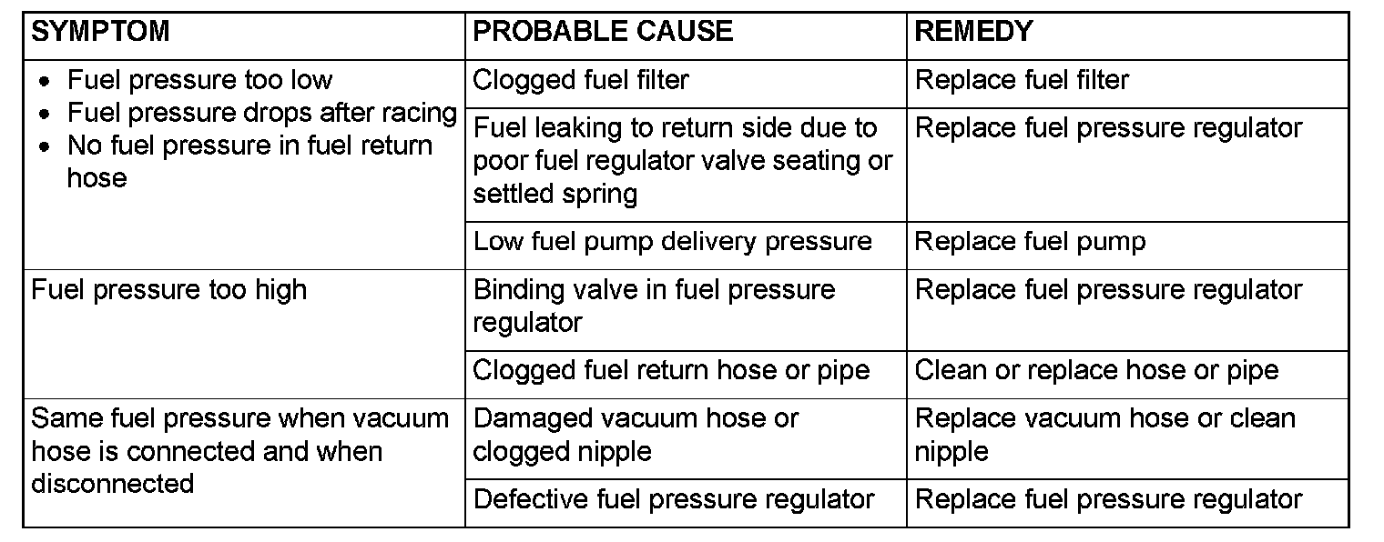 12. If any of fuel pressure measured in steps 8 to 11 is out of specification, troubleshoot and repair according to the table below.