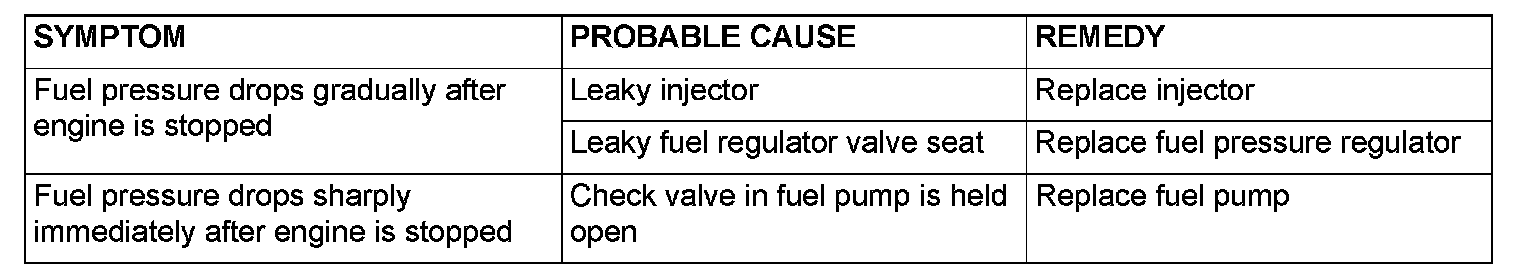 13. Stop the engine and observe fuel pressure gauge reading. It is normal if the reading does not drop within two minutes. If it does, observe the rate of drop and troubleshoot and repair according to the table below. Start, then stop the engine.