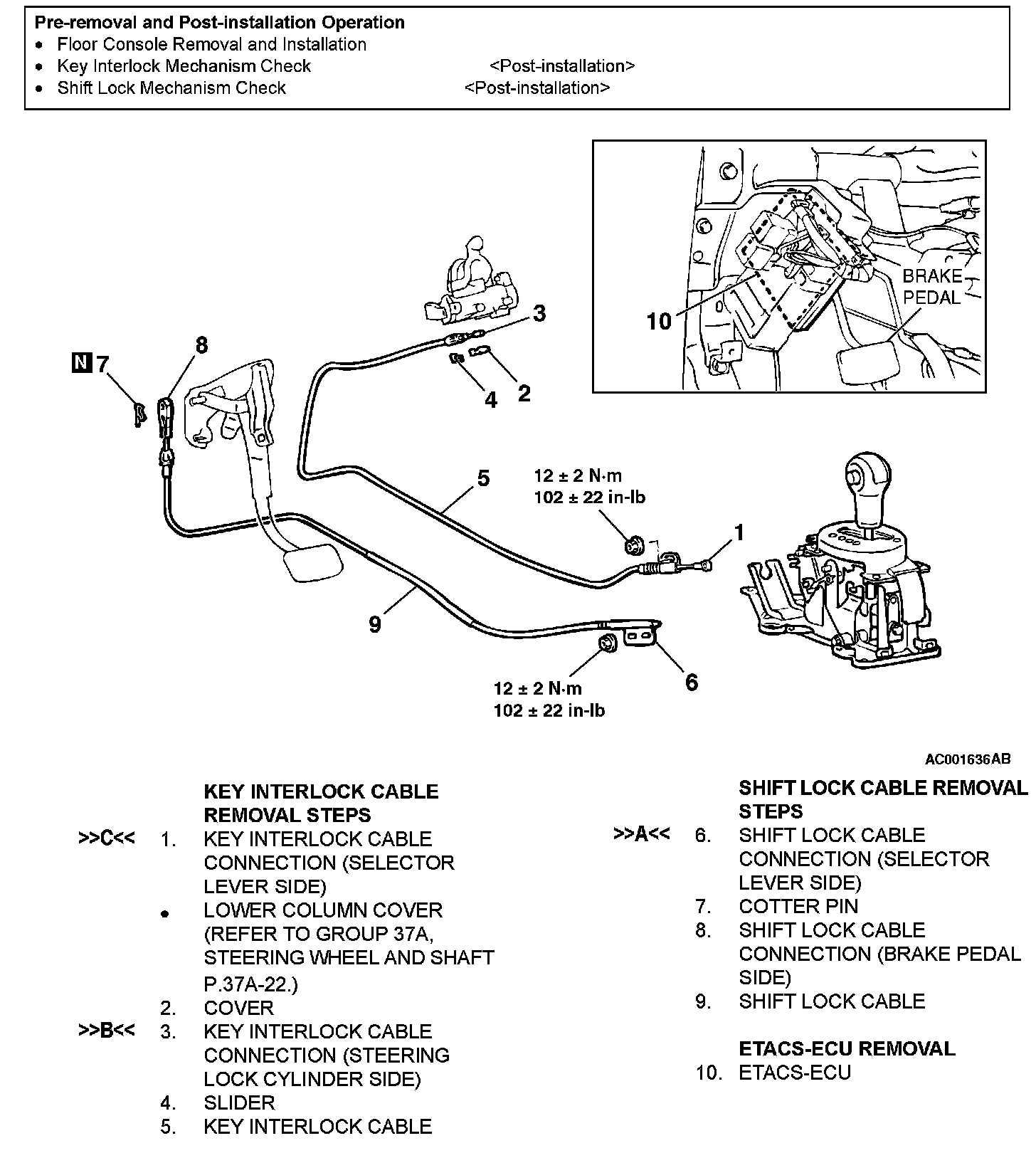 CAUTION: When removing and installing the key interlock cable and shift lock cable, be careful not to hit the SRS-ECU.