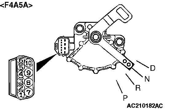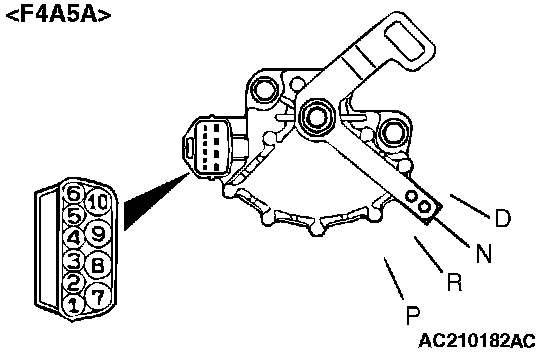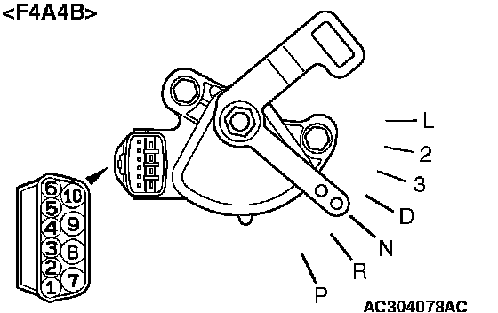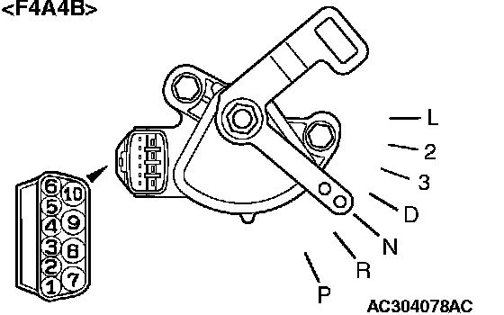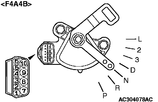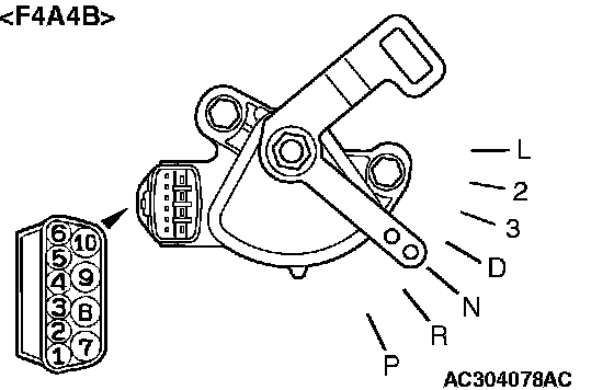 ^ Move the selector lever to "P," "R," "N," "D," "3," "2," "L" and sport mode positions and confirm that the selected transmission range match the positions shown on scan tool MB991958. (Vehicles with sport mode is indicated as "D" on the scan tool).