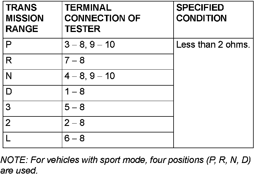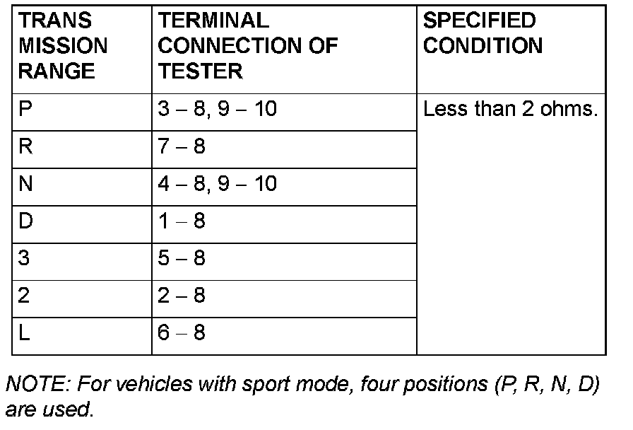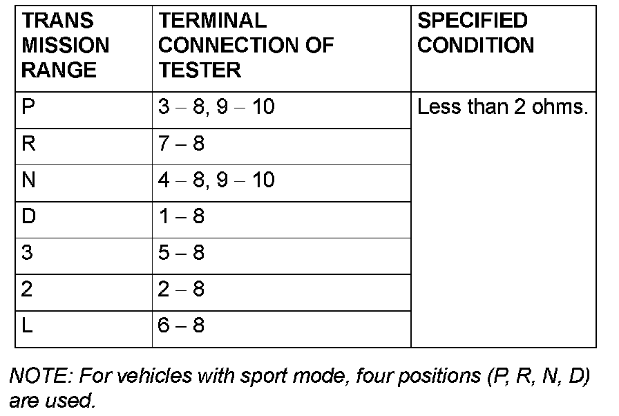 STEP 2. Check the transmission range switch. Measure the resistance between the terminals for each transmission range as indicated in the table.