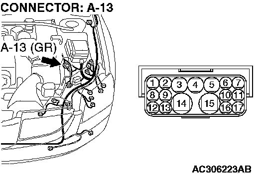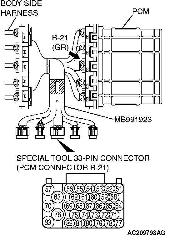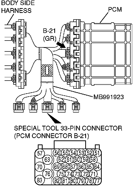 2. Connect special tool MB991923 (check harness) between the PCM and the body-side harness connector.