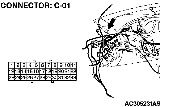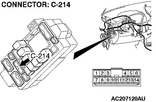 STEP 3. Check intermediate connector A-13, transmission range switch connector B-110, joint connector (1) C-01 and junction block connector C-214 for loose, corroded or damaged terminals, or terminals pushed back in the connector.