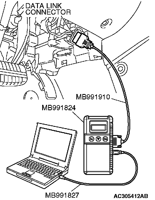 CAUTION: To prevent damage to scan tool MB991958, always turn the ignition switch to the "LOCK" (OFF) position before connecting or disconnecting scan tool MB991958.