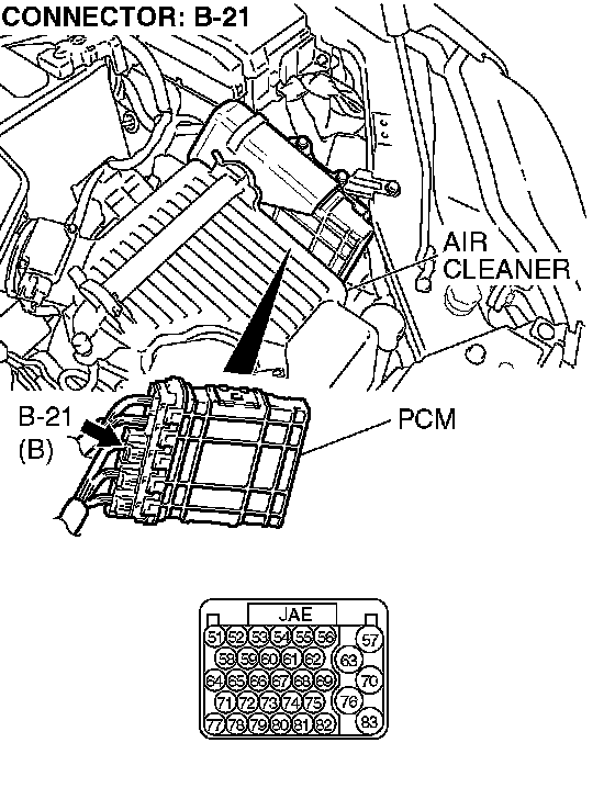 STEP 11. Check PCM connector B-21 for loose, corroded or damaged terminals, or terminals pushed back in the connector.