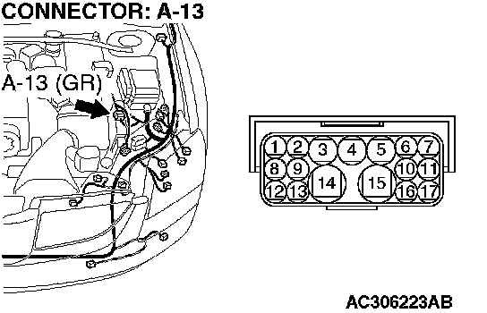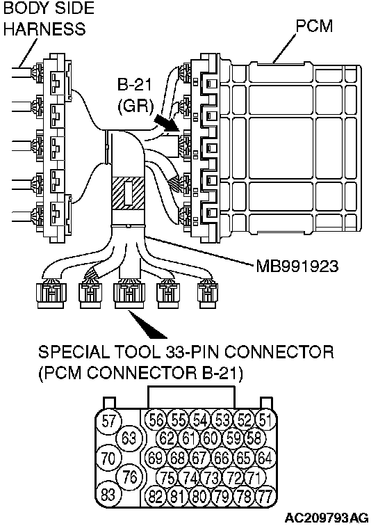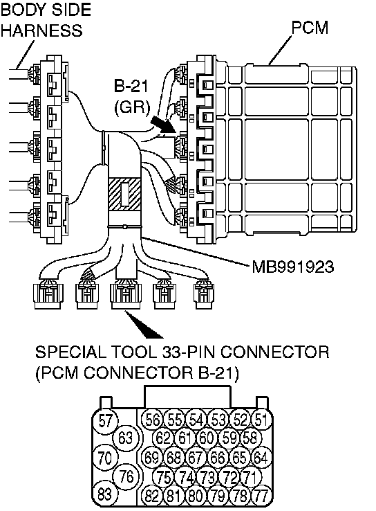 2. Connect special tool MB991923 (check harness) between the PCM and the body-side harness connector.