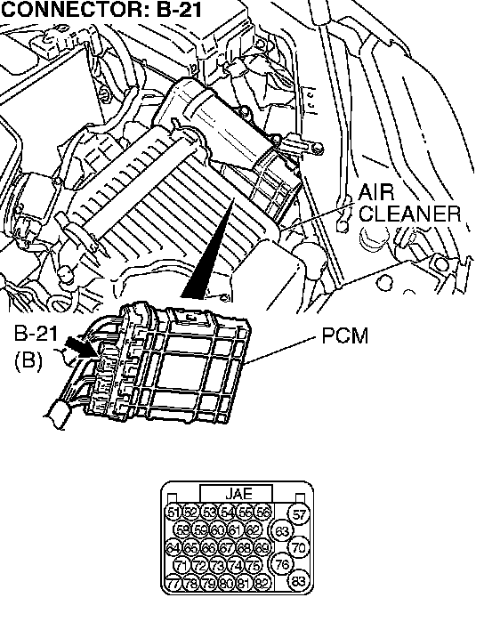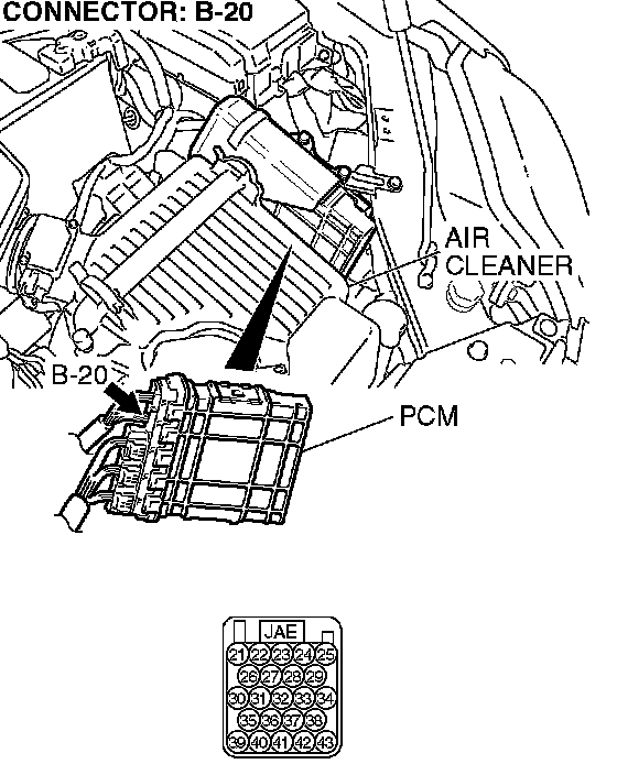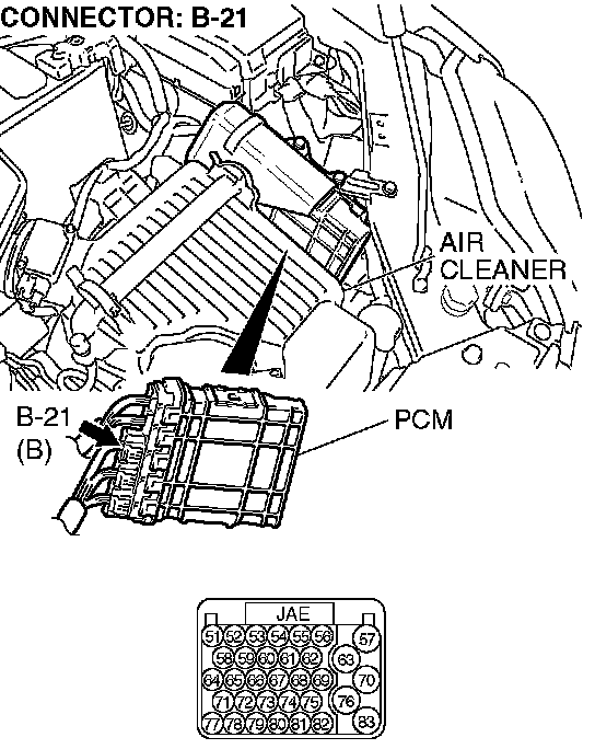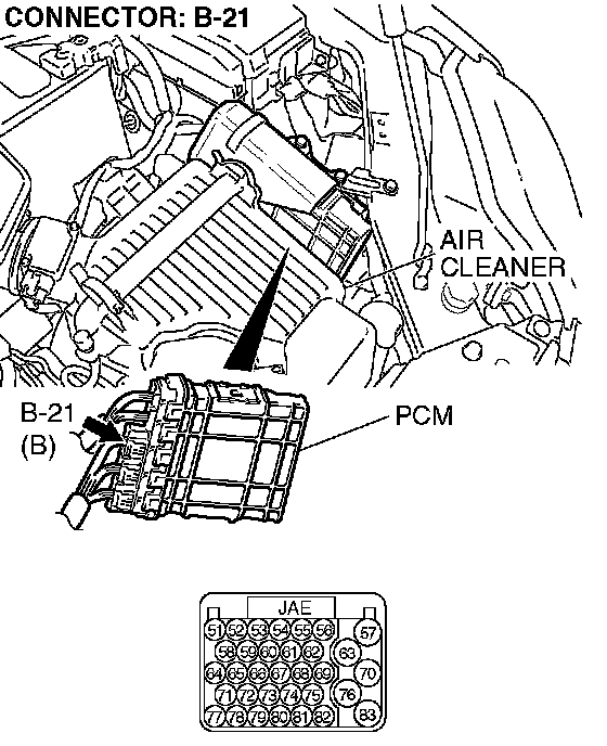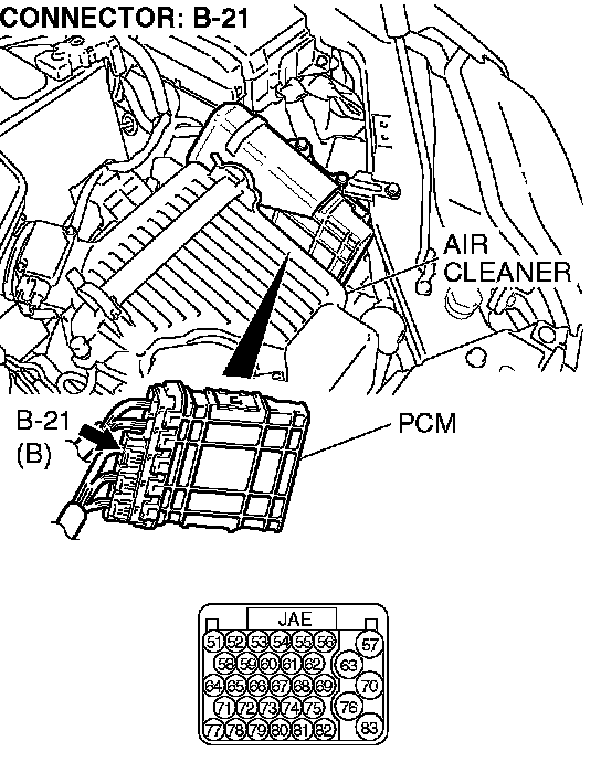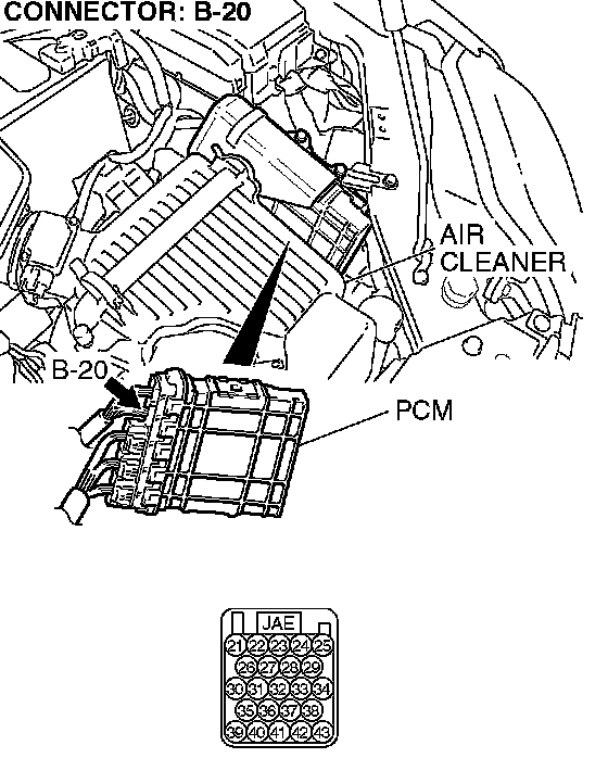 STEP 20. Check PCM connector B-21 for loose, corroded or damaged terminals, or terminals pushed back in the connector.