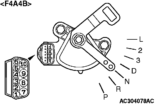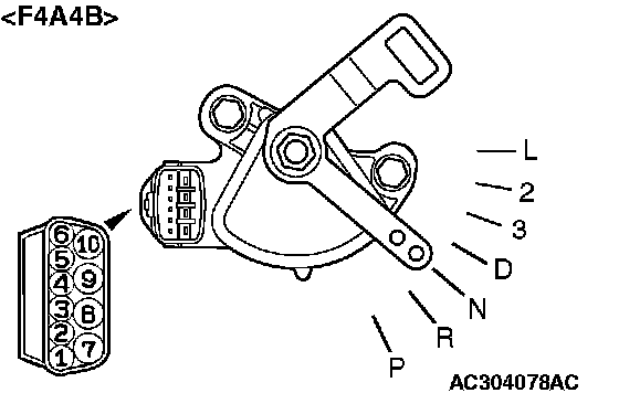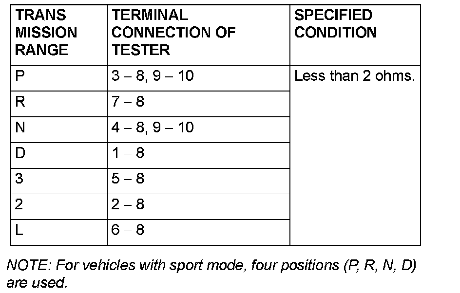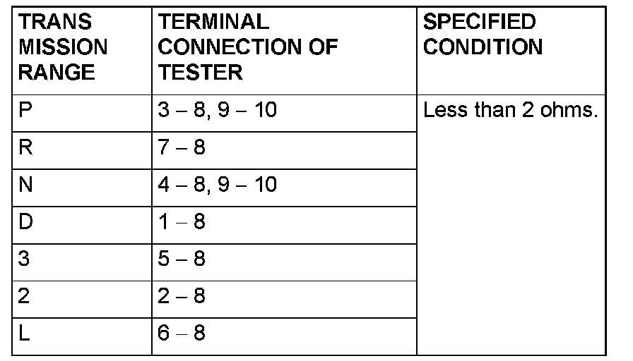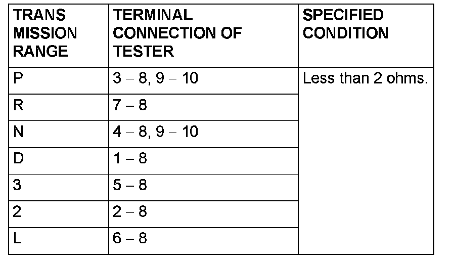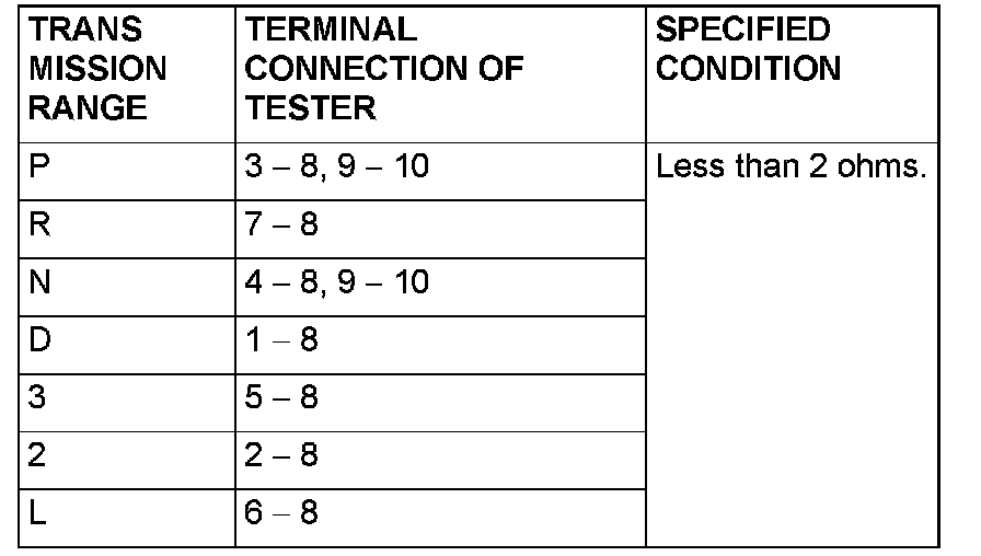 Measure the resistance between the terminals for each transmission range as indicated in the table.
