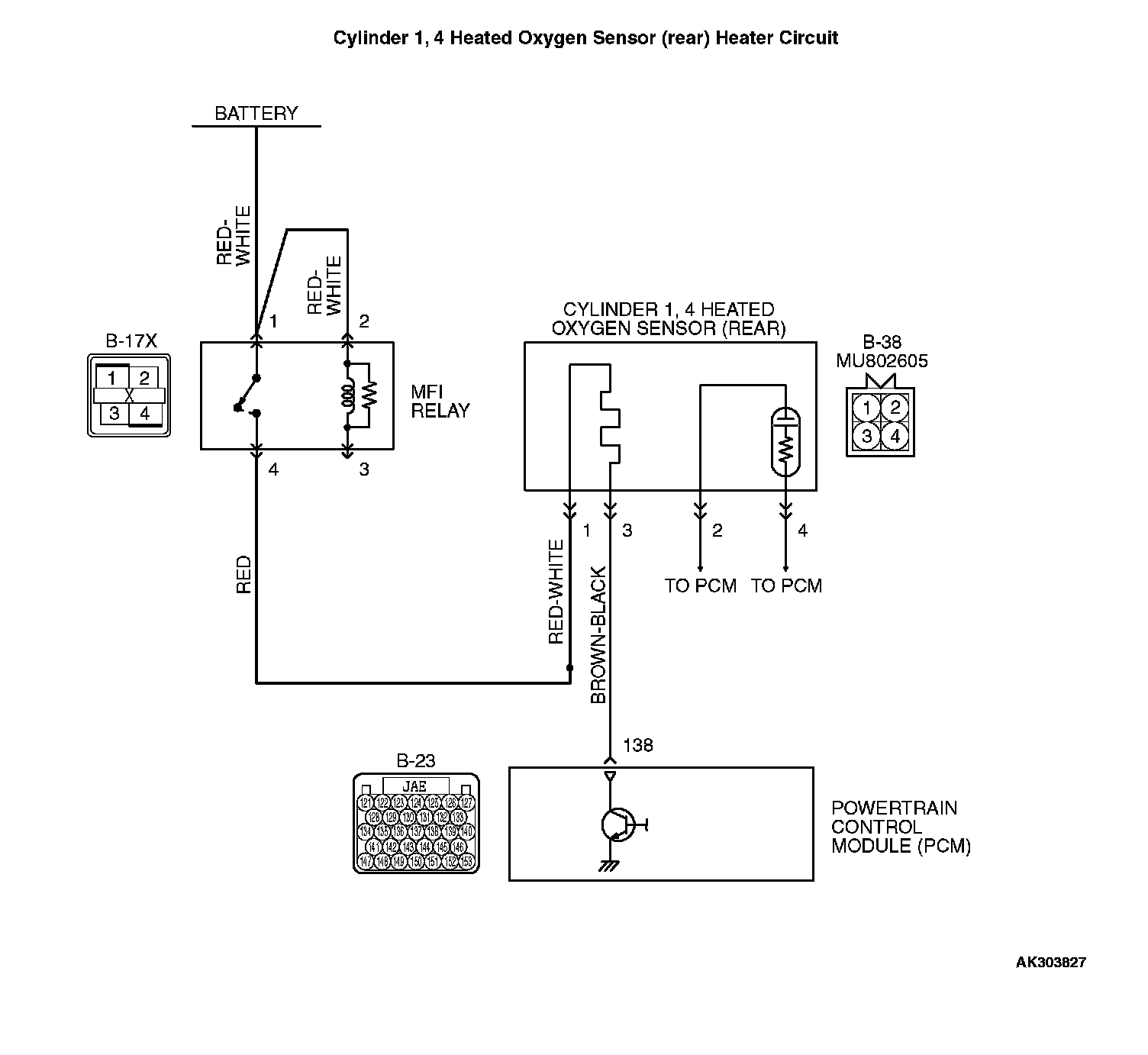- Power is supplied from the MFI relay (terminal No. 4) to the cylinder 1, 4 heated oxygen sensor (rear) heater.