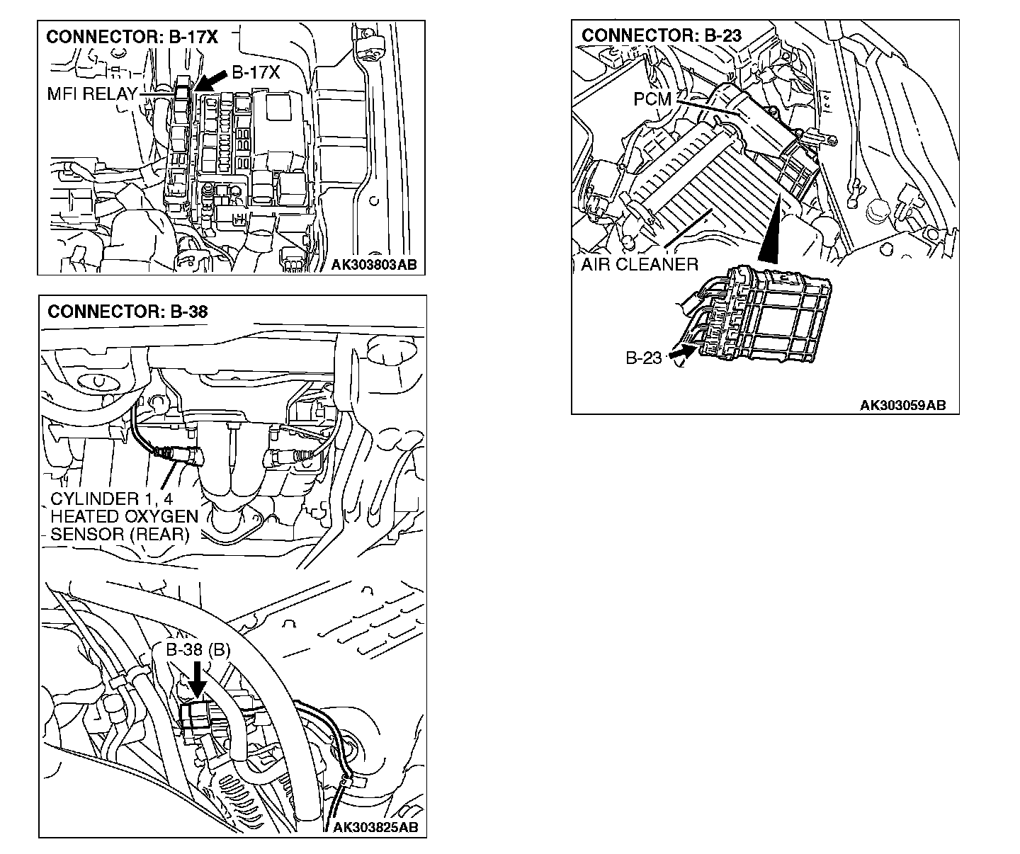 STEP 9. Check for harness damage between MFI relay connector B-17X (terminal No. 4) and cylinder 1, 4 heated oxygen sensor (rear) connector B-38 (terminal No. 1).