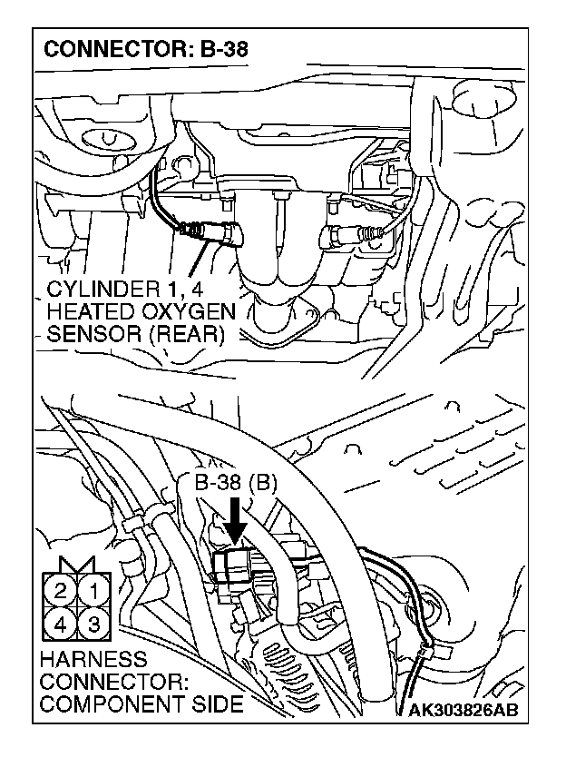 STEP 1. Check harness connector B-38 at the cylinder 1, 4 heated oxygen sensor (rear) for damage.
