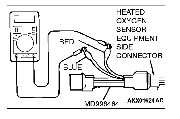 2. Measure the resistance between heated oxygen sensor connector terminal No. 1 (red clip) and terminal No. 3 (blue clip).