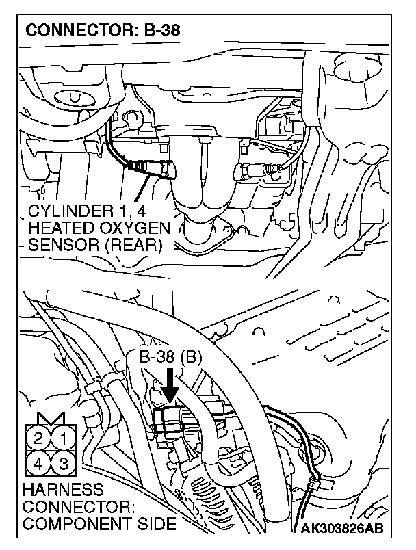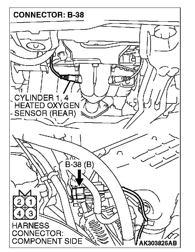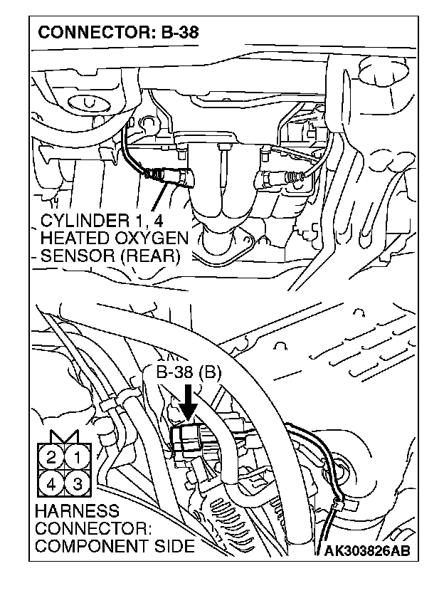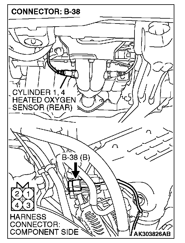 1. Disconnect cylinder 1, 4 heated oxygen sensor (rear) connector B-38 and connect test harness special tool, MD996484, to the connector on the cylinder 1, 4 heated oxygen (rear) sensor side.