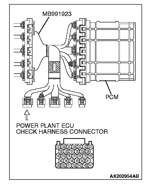 1. Disconnect the all PCM connectors and connect power plant ECU check harness special tool MB991923 between the separated connectors.