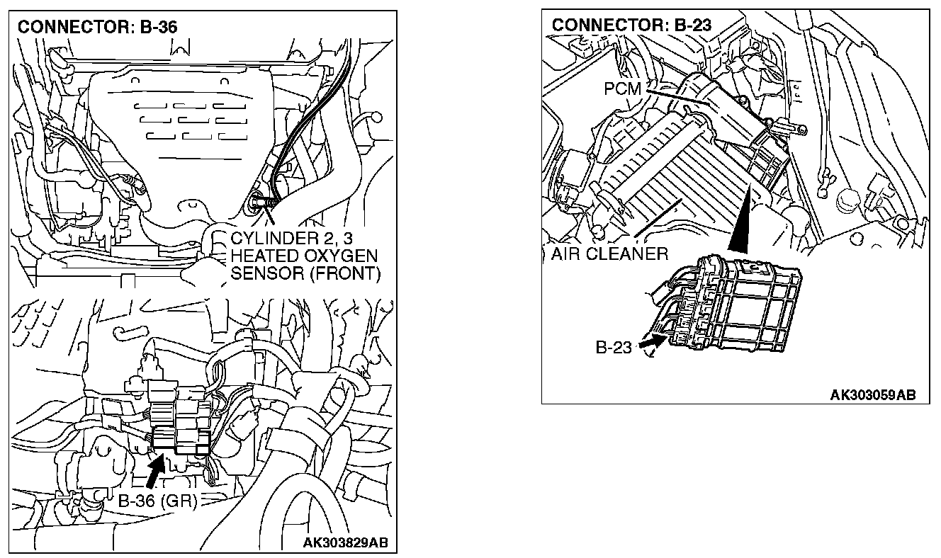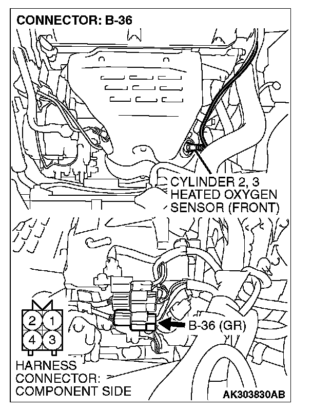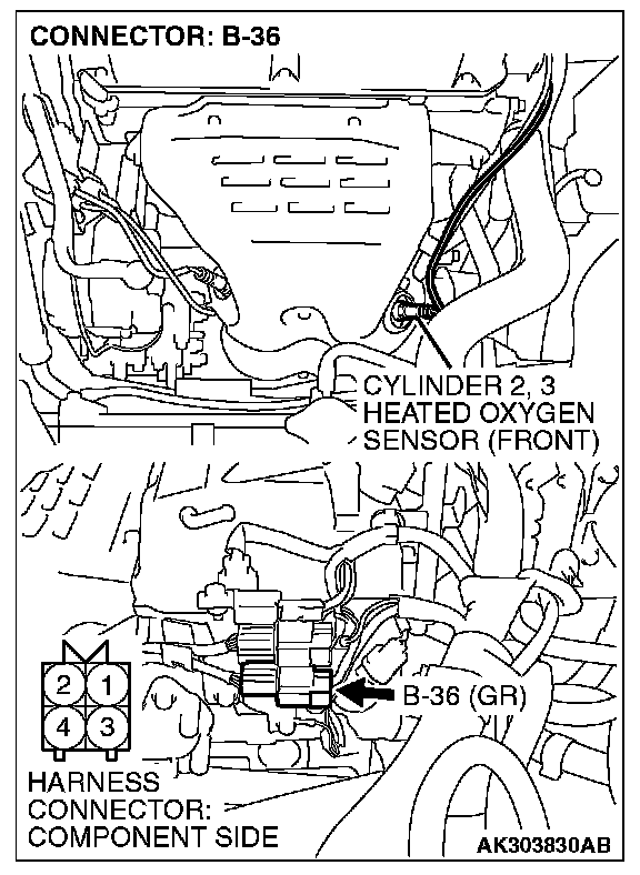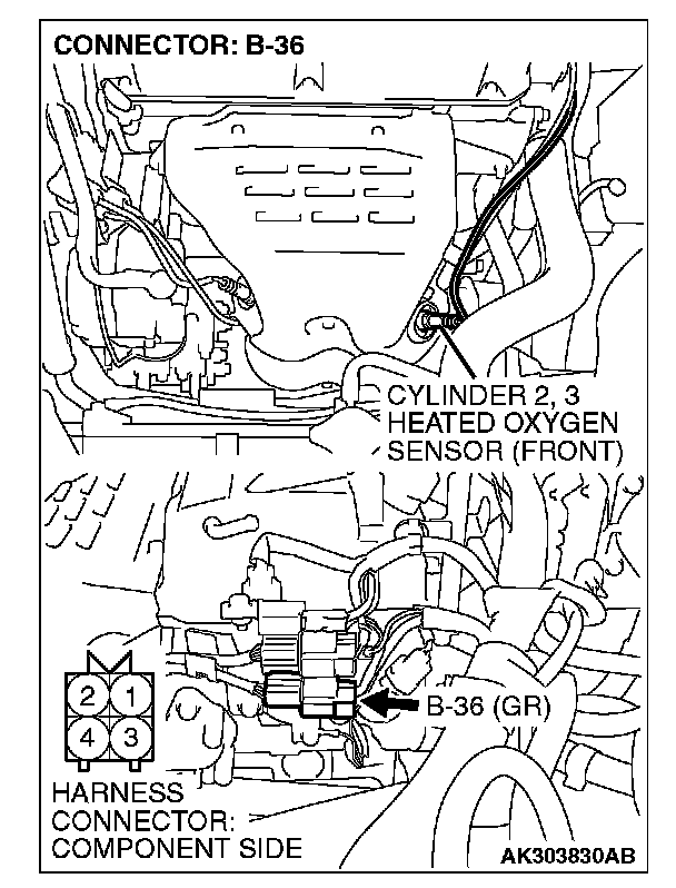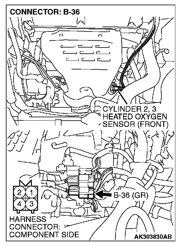 1. Disconnect cylinder 2, 3 heated oxygen sensor (front) connector B-36 and connect test harness special tool, MB991316, to the connector on the cylinder 2, 3 heated oxygen (front) sensor side.