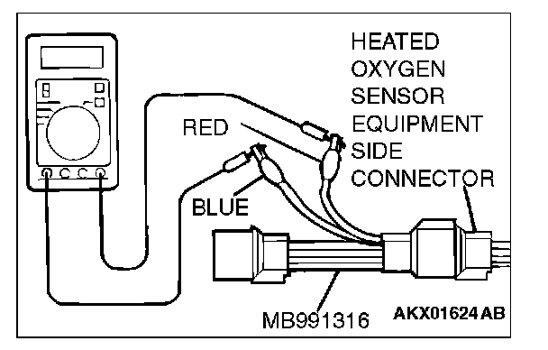 2. Measure the resistance between heated oxygen sensor connector terminal No. 1 (red clip) and terminal No. 3 (blue clip).