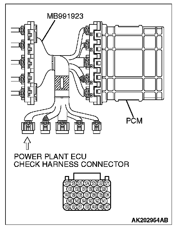 1. Disconnect the all PCM connectors and connect power plant ECU check harness special tool MB991923 between the separated connectors.