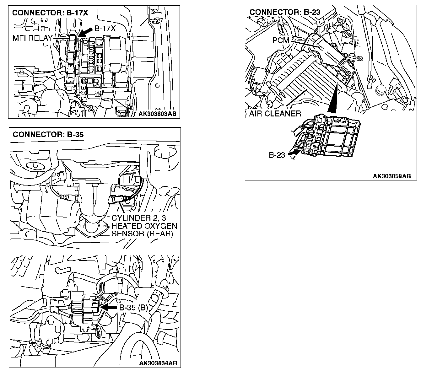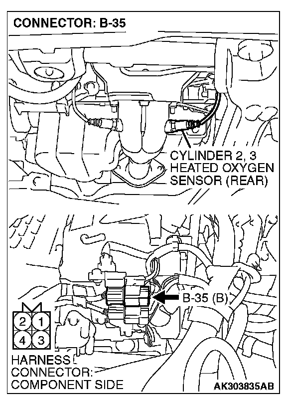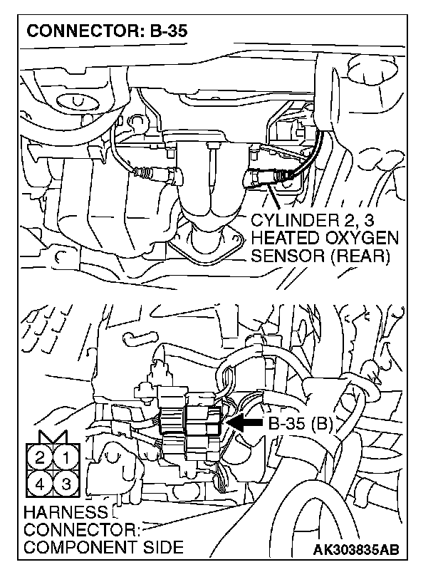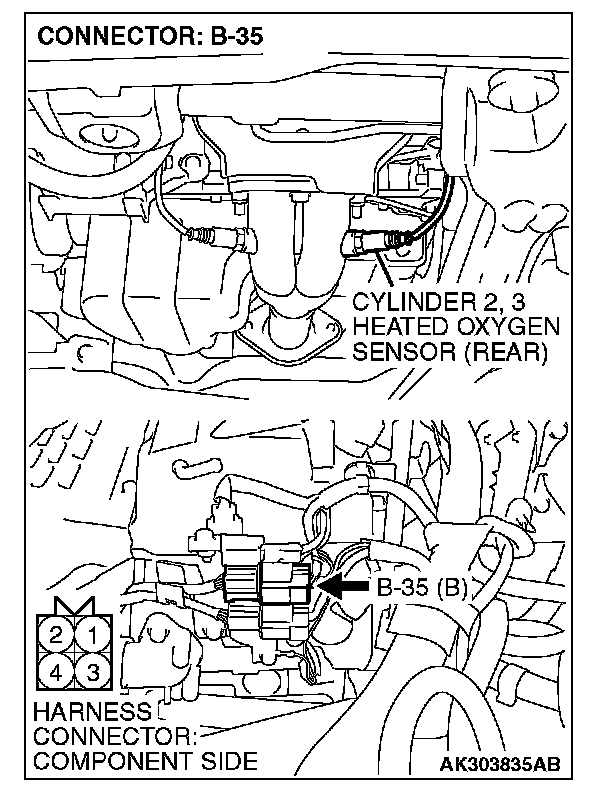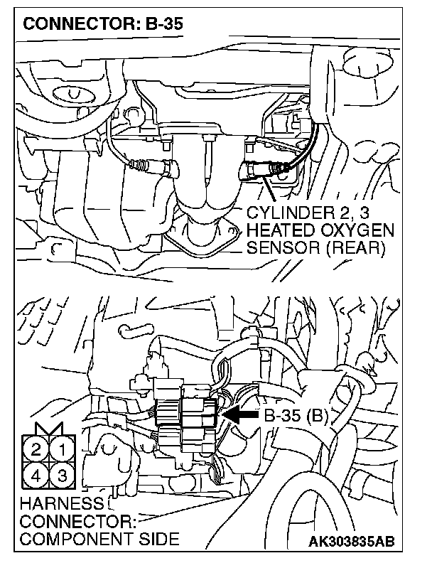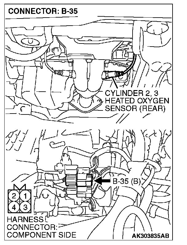 1. Disconnect cylinder 2, 3 heated oxygen sensor (rear) connector B-35 and connect test harness special tool, MD998464, to the connector on the cylinder 2, 3 heated oxygen (rear) sensor side.