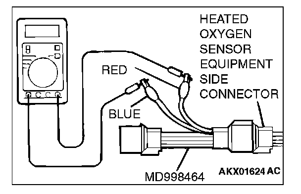 2. Measure the resistance between heated oxygen sensor connector terminal No. 1 (red clip) and terminal No. 3 (blue clip).