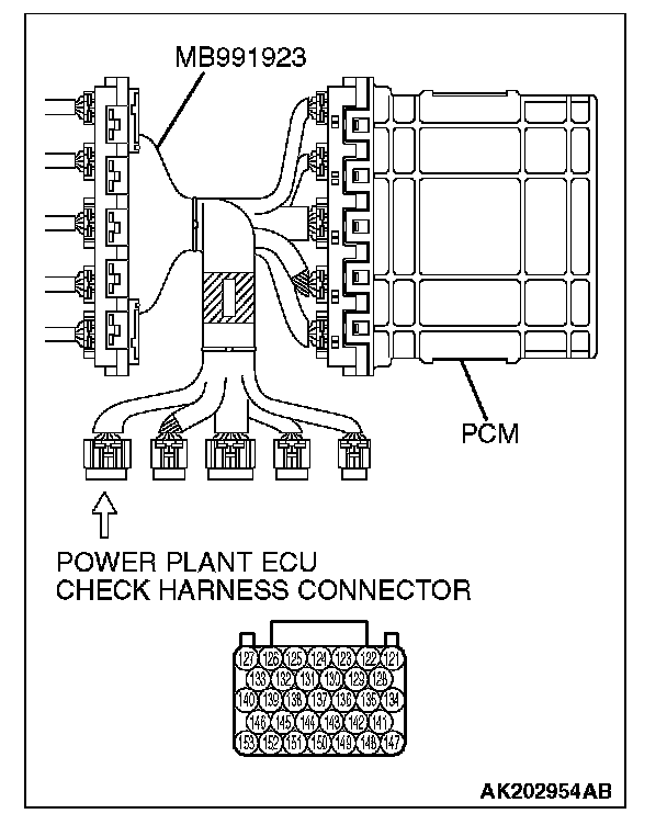 1. Disconnect the all PCM connectors and connect power plant ECU check harness special tool MB991923 between the separated connectors.