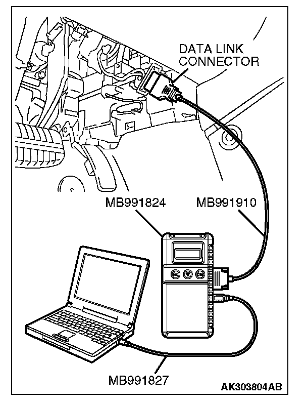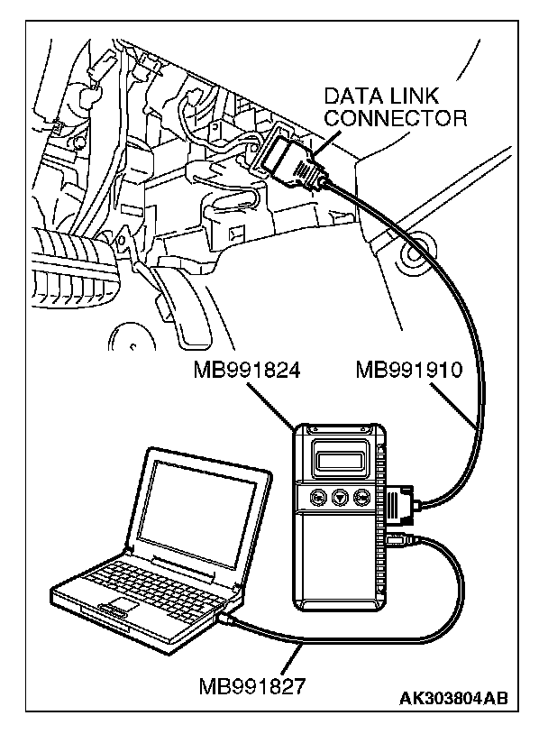 CAUTION: To prevent damage to scan tool MB991958, always turn the ignition switch to the "LOCK" (OFF) position before connecting or disconnecting scan tool MB991958.