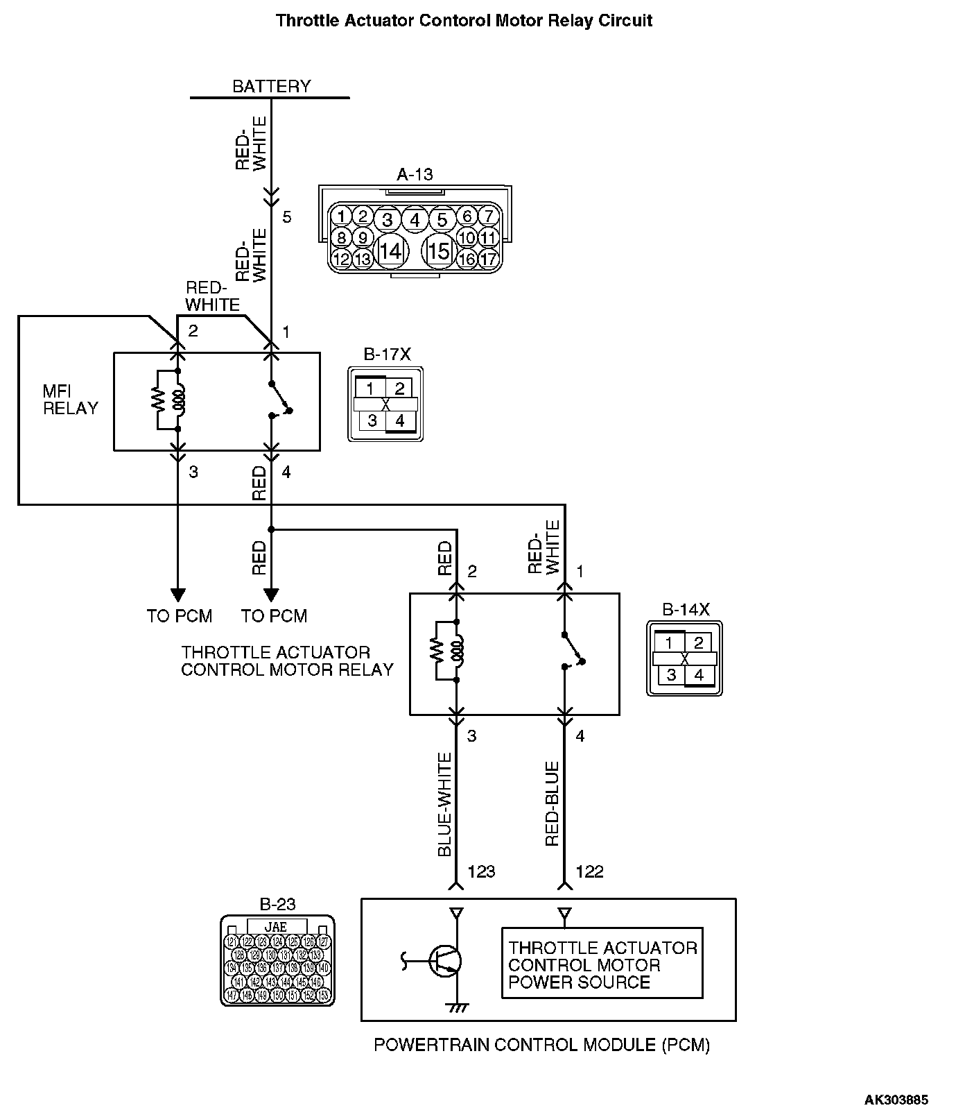 - When the throttle actuator control motor relay turns ON, battery positive voltage is supplied by the throttle actuator control motor relay (terminal No. 4) to the PCM (terminal No. 122).
