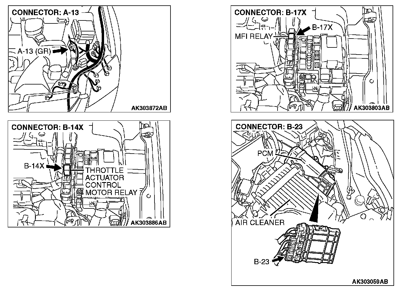STEP 9. Check for harness damage between MFI relay connector B-17X (terminal No. 4) and throttle actuator control motor relay connector B-14X (terminal No. 2).