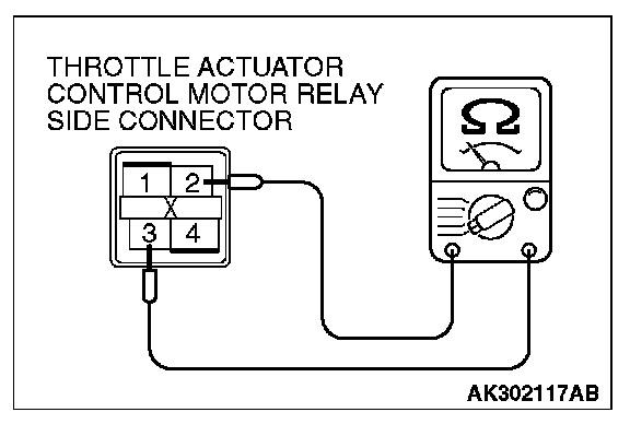 2. Check for continuity between the throttle actuator control motor relay terminal No. 2 and No. 3.