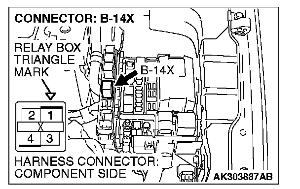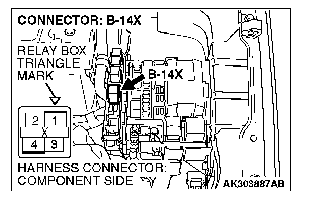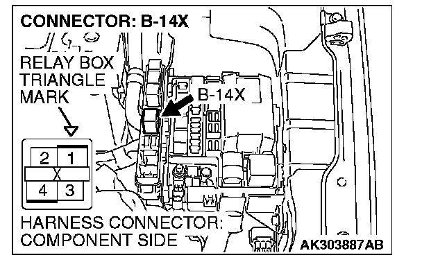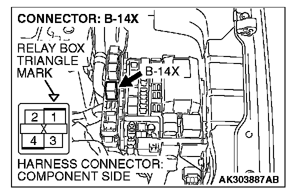 CAUTION: Because it is difficult to distinguish the top and bottom of the throttle actuator control motor relay connector at the wiring harness, inspect it by using triangle mark on the junction block as a reference.