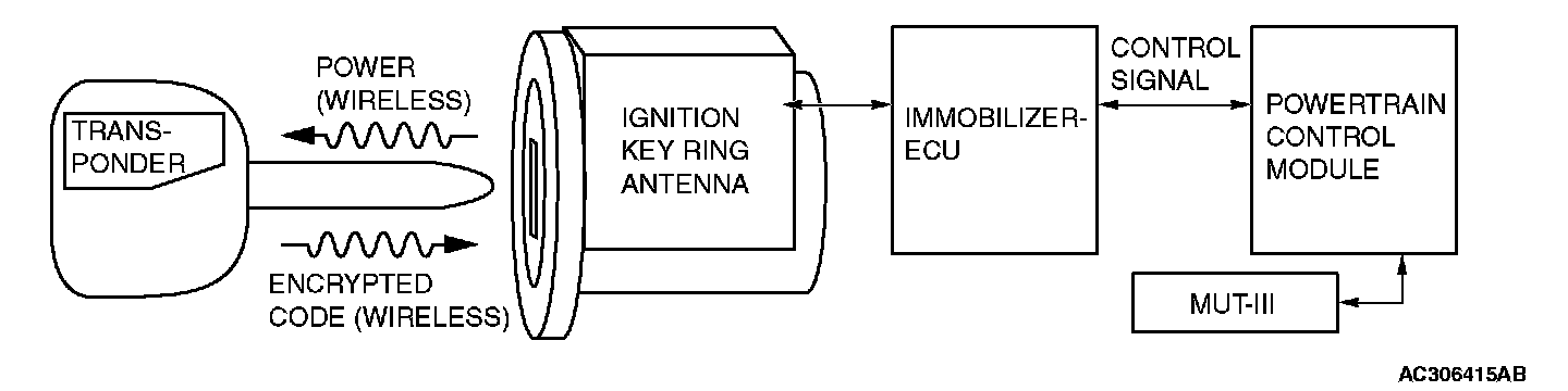 The immobilizer system consists of the ignition key, the key ring antenna, immobilizer-ECU, and the PCM. The ignition key has a built-in transponder. The key ring antenna is installed on the steering lock key cylinder. Only the registered ignition key permits the engine to start, therefore, the engine can never be started by means of a forged key or by connecting the ignition wiring directly. The system is significantly safe and reliable against theft. In addition, the driver has only to turn the ignition switch to the "ON" position to activate the immobilizer system. If the requirements for starting the engine are not satisfied, the engine will be immobilized. If a registered ignition key is lost, all your ignition keys need to be registered again using scan tool MB991958 (MUT-III Sub Assembly) to ensure security (Refer to Service and Repair/Procedures/How To register Encrypted Code). An additional ignition key can be registered as follows (only if no ignition keys are lost):
