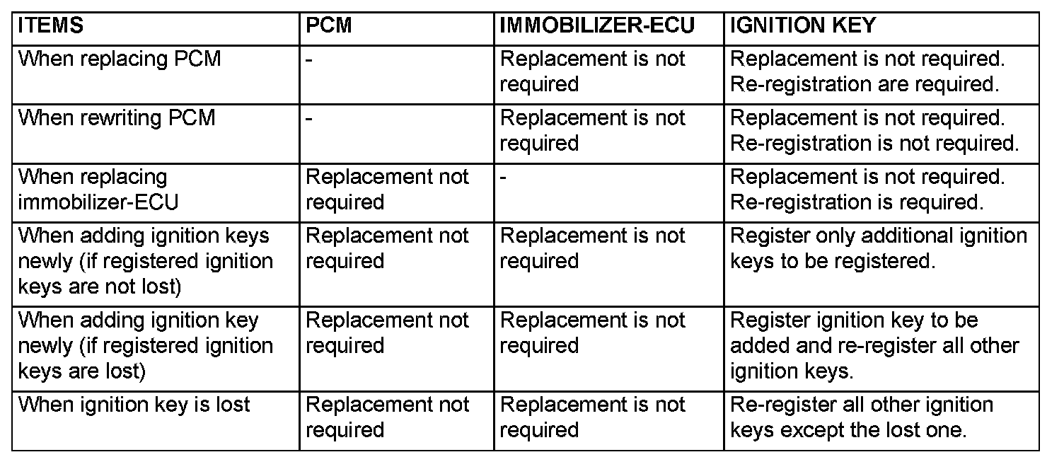 To replace immobilizer system related parts, refer to the table given. When the ignition key is re-registered with scan tool MB991958, the originally registered ignition key registration information will be lost.