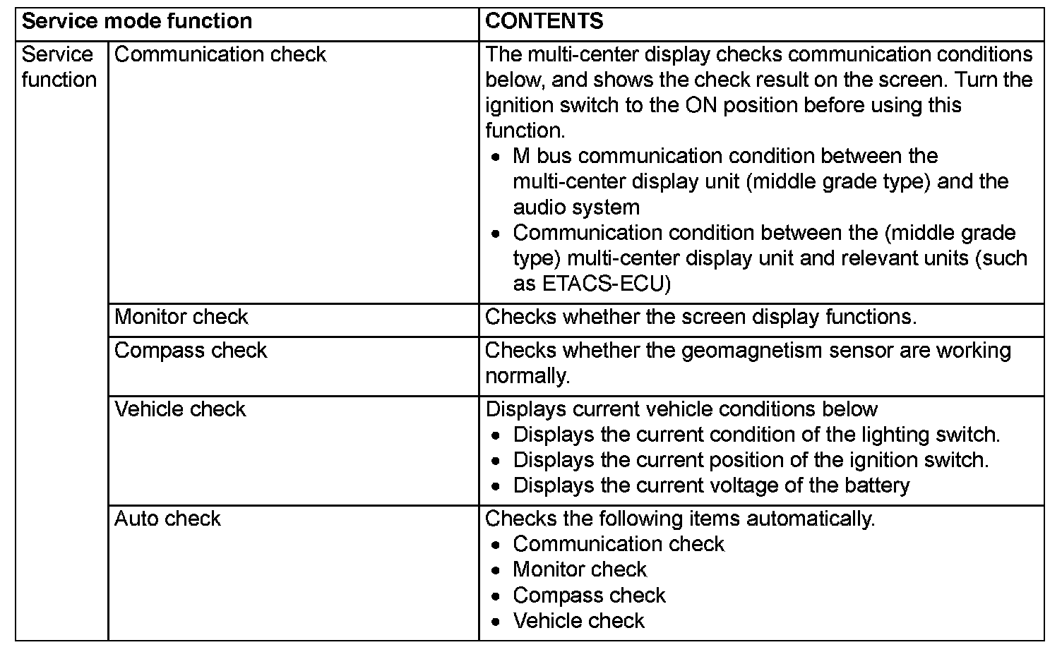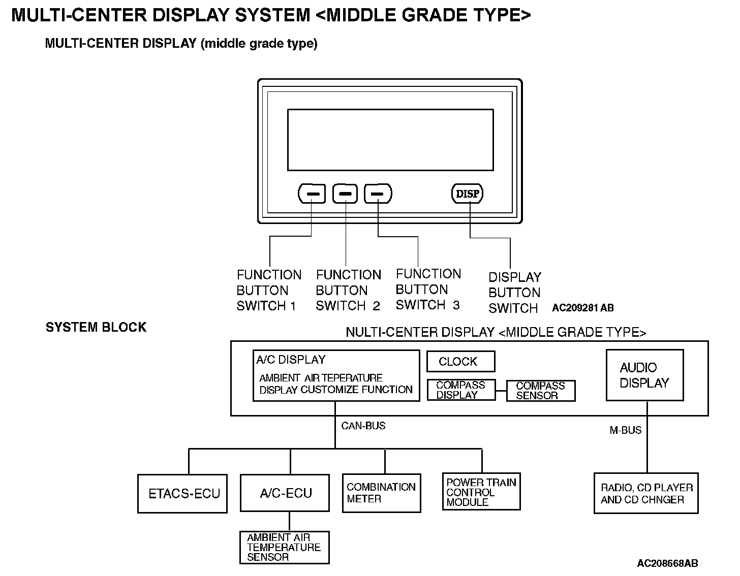 Two types of multi-center display are available; low grade type and middle grade type. The middle grade type display can show a message based on information, which is obtained via M bus and CAN bus communication. In addition, the middle grade type display offers a service mode function (self-diagnosis), overwrite (customize) function of the ETACS and multi-center display setting.