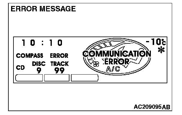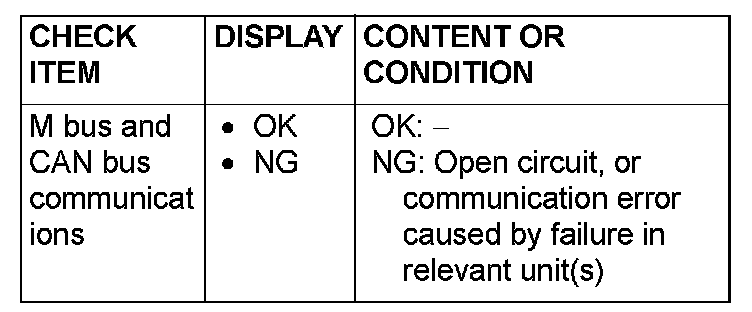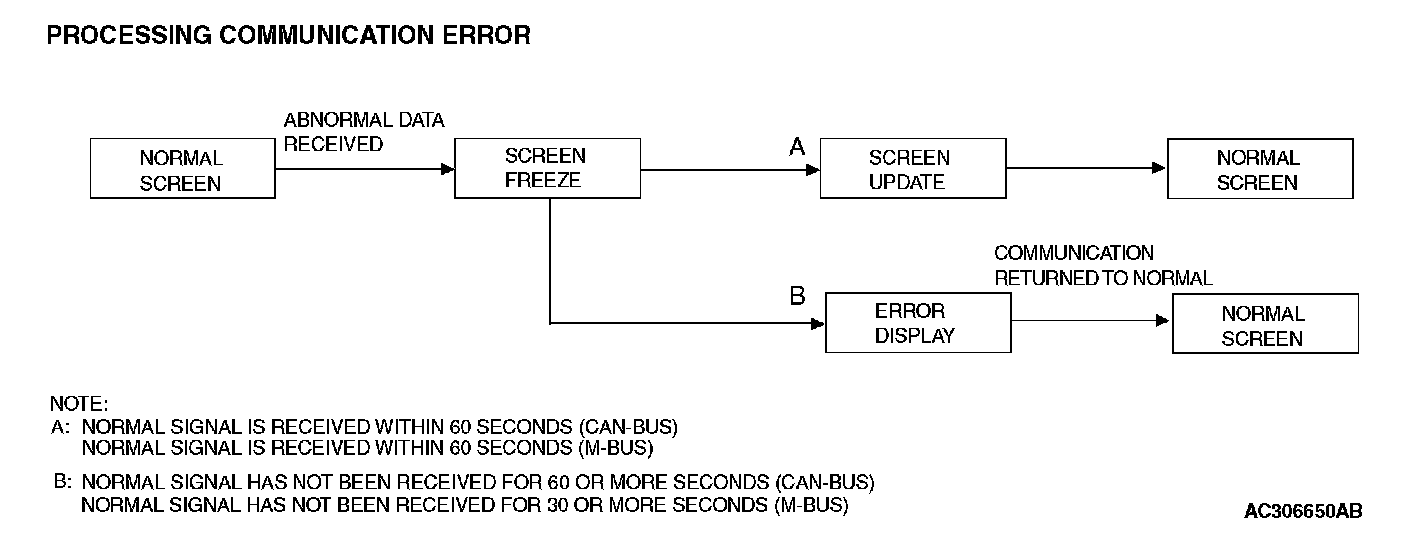 The multi-center display unit (middle grade type) communicates with specific units via CAN and M bus lines. If an abnormality occurs (such as communication cancellation, interruption or out-of-range data), the screen will be frozen for some time. If a correct signal is received within specific period after that, the screen will be updated. If not, "COMMUNICATION ERROR" will be displayed on the screen. This screen indicates a failure in the multi-center display unit (middle grade type) itself, communication error with relevant units, components or sensor. In this case, you can pinpoint a trouble spot according to the CAN communication DTC code chart.