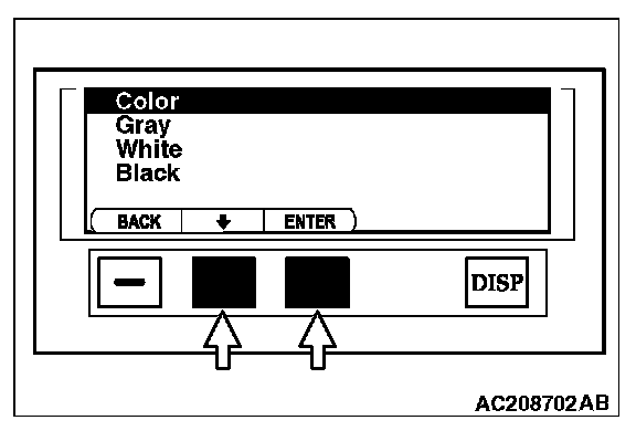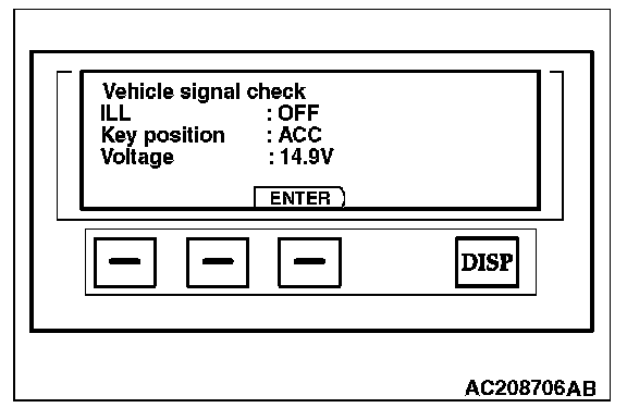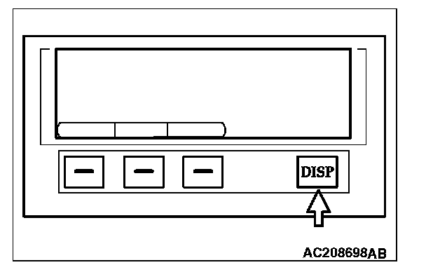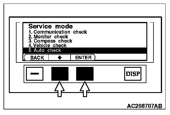 2. Turn the ignition switch to the "ACC" position while depressing the "DISP" button on the multi-center display unit (middle grade type). After approximately 5 seconds, the service mode start-up screen is displayed.
