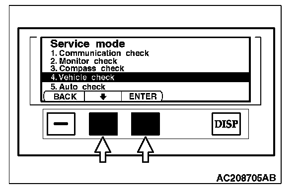 1. Choose "vehicle check" from the service mode start-up screen by pressing function button switch 2, and then execute a check by pressing function button switch 3.