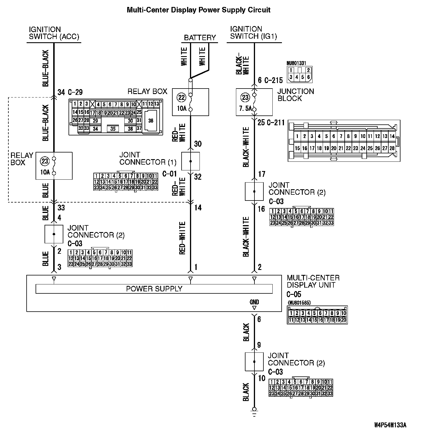 The multi-center display unit (middle grade type) is energized by the battery through the ignition switch (ACC) and (IG1).