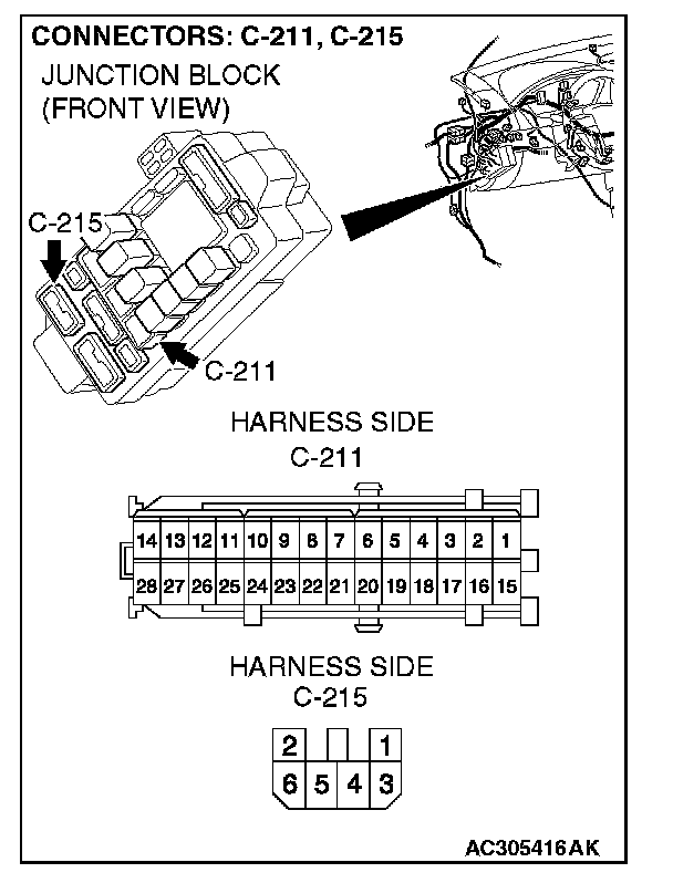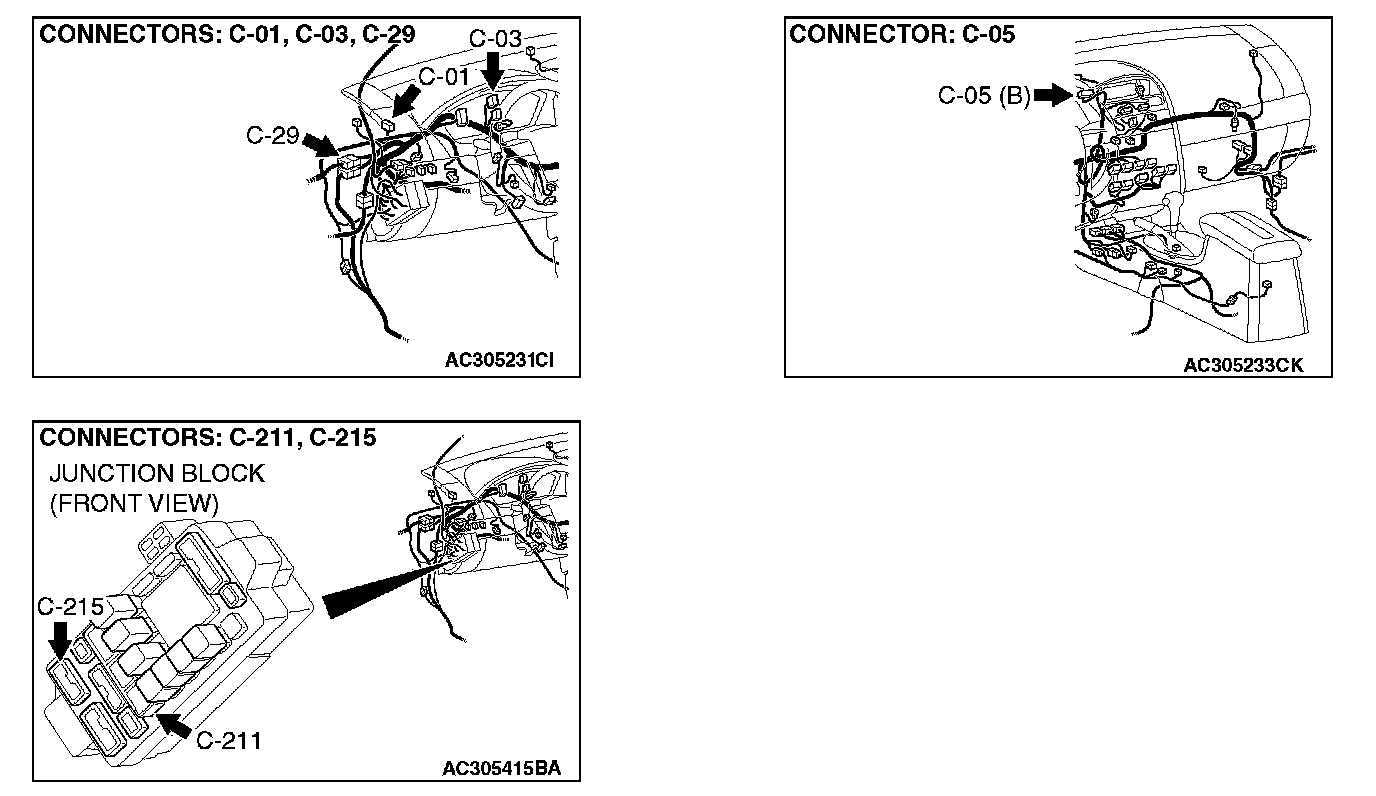 NOTE: Also check joint connector (2) C-03, junction block connector C-211 and C-215 for loose, corroded, or damaged terminals, or terminals pushed back in the connector. If joint connector (2) C-03 or junction block connector C-211 or C-215 is damaged, repair or replace the wiring harness. Refer to Harness Connector Inspection.