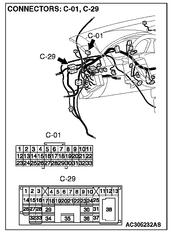 NOTE: Also check intermediate connector C-29 and joint connector 1. C-01 for loose, corroded, or damaged terminals, or terminals pushed back in the connector. If intermediate connector C-29 and joint connector 1. C-01 is damaged, repair or replace the wiring harness. Refer to Harness Connector Inspection.