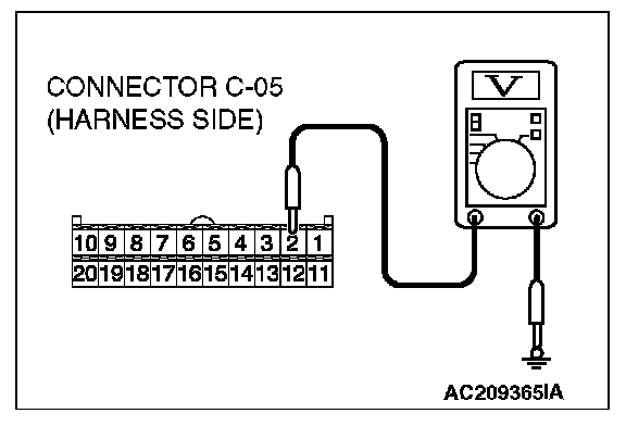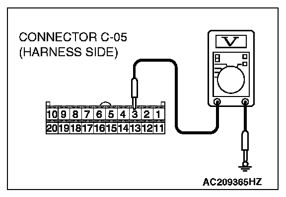 STEP 10. Check the multi-center display unit (middle grade type) power supply circuit [ignition switch (IG1)]. Measure the voltage at the multi-center display unit (middle grade type) connector C-05.