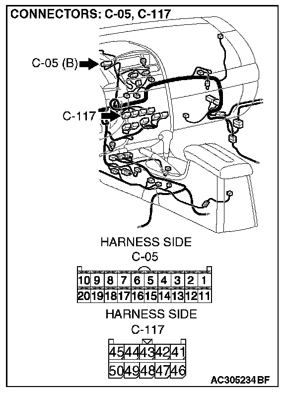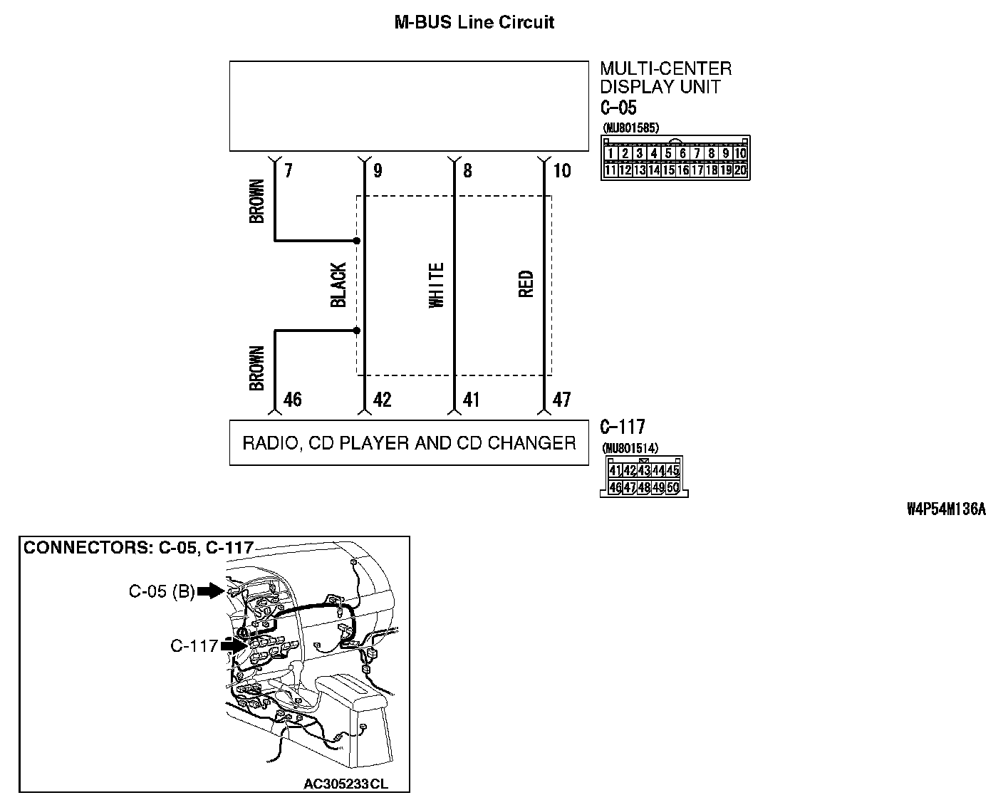 1. Connect the multi-center display unit (middle grade type) connector C-05 and radio, CD player and CD changer connector C-117.