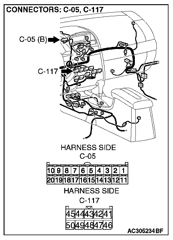 STEP 3. Check the wiring harness between radio, CD player and CD changer connector C-117 (terminal 46, 42, 41 and 47) and multi-center display unit (middle grade type) connector C-05 (terminal 7, 8, 9 and 10).