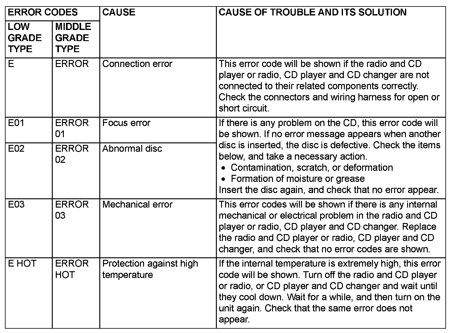 If the radio and CD player or radio, CD player and CD changer detects any malfunction in itself or the inserted CD, the error codes will be shown on the multi-center display.