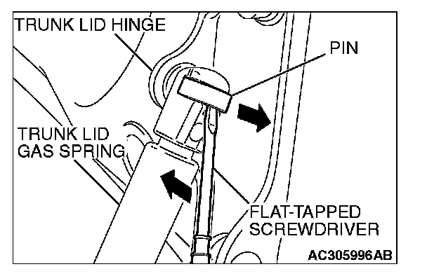 As shown in the figure, slide the pin upward, then remove the trunk lid gas spring in the direction of the arrow to unscrew the trunk lid hinge.
