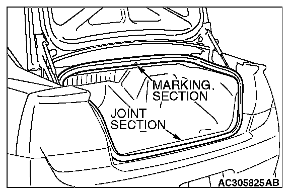 Install the trunk lid weatherstrip so that the marking and the joint are aligned with the body center line.
