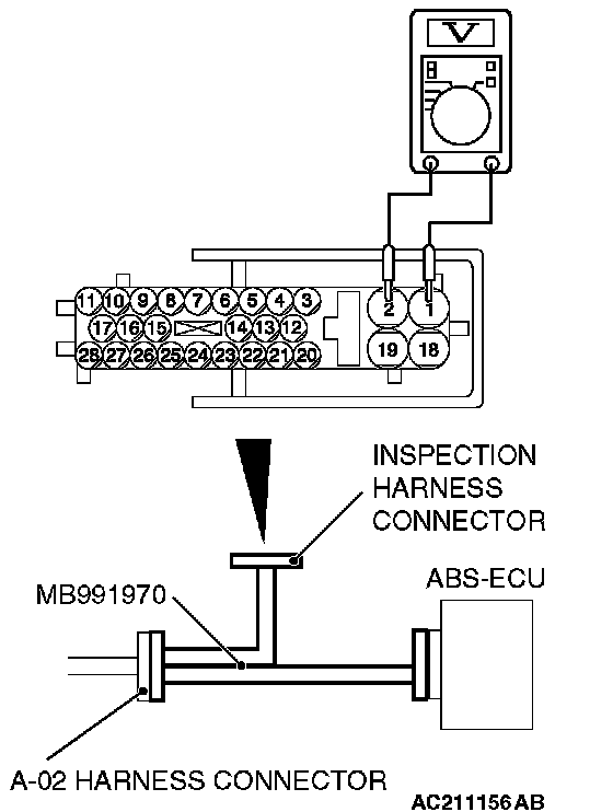 1. Disconnect the ABS-ECU connector A-02, and then use special tool MB991970 to measure the voltages between terminals (2) and each terminal other than terminal (18). Also measure voltages between terminal (18) and each terminal other than terminal (2).